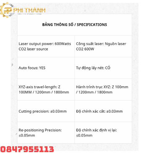- Công suất laser: 600W (CO2)
